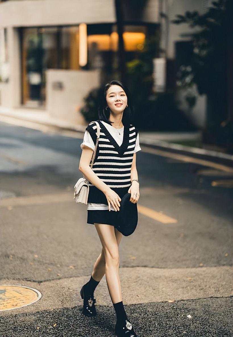 Clean and simple casual white T-shirt is paired with a knitted vest designed with black and white stripes. The classic retro stripe elements make the overall match more advanced. The fashionable texture and the overlaying of solid colors and patterns make the overall look more layered. Paired with a high-waisted short skirt that highlights the beautiful legs, the overall look is more girlish and energetic, retro yet elegant.