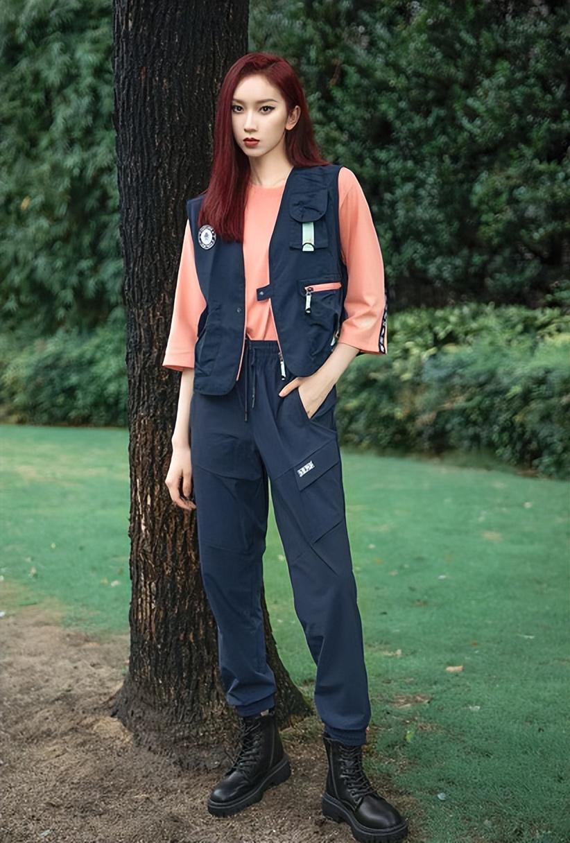 The energetic orange three-quarter short-sleeves are paired with a navy blue work vest, a deep and bright color combination, adding It adds a fashionable impact to the overall look, and the overlay and matching of neutral styles can easily create a girl’s unique sweet and cool charm.
