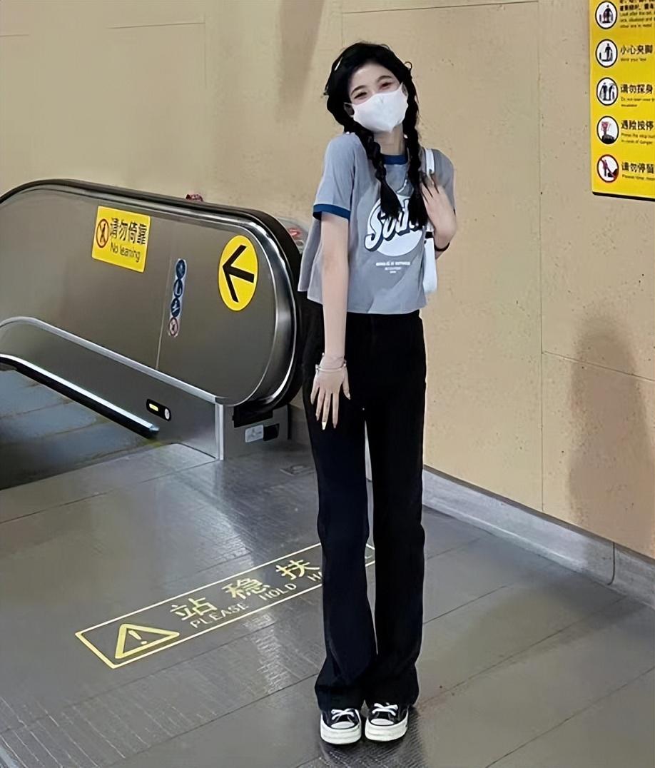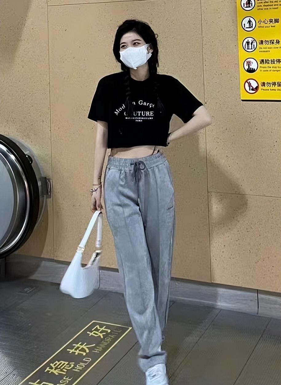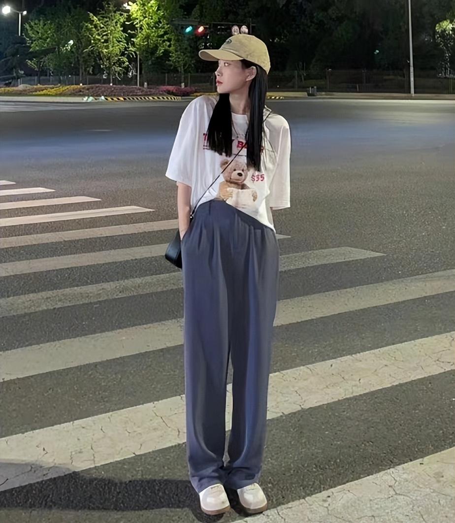 For petite girls, if you want to achieve a satisfactory heightening effect, the combination of navel-baring short T-shirts and trousers is absolutely the best option. ,Through the short design of the T-shirt, you can confidently show off your small waist. In contrast to the loose hem, the upper body looks slimmer, and the matching high-waisted trousers expose the skin at the waist. With the help of it, the legs will look slimmer and longer, creating a satisfying slimming effect.