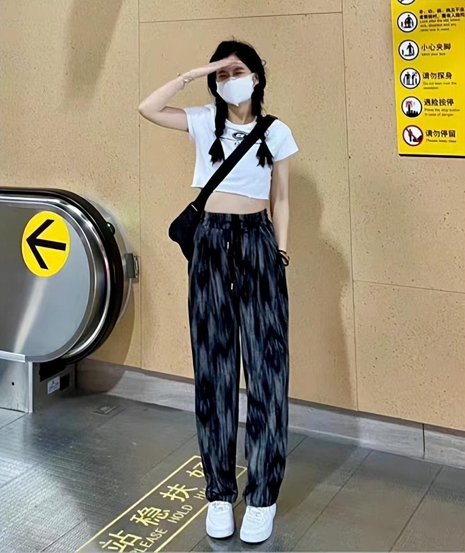 Using the tight-fitting and skin-exposed design of the T-shirt, the girl’s slender figure and playful sense of youth can be well presented. The design of trousers that cover the flesh and make the body look slimmer, with the tie-dye technology, presents a more fashionable sense. The vertical lines are blended to make the trousers more prominent.