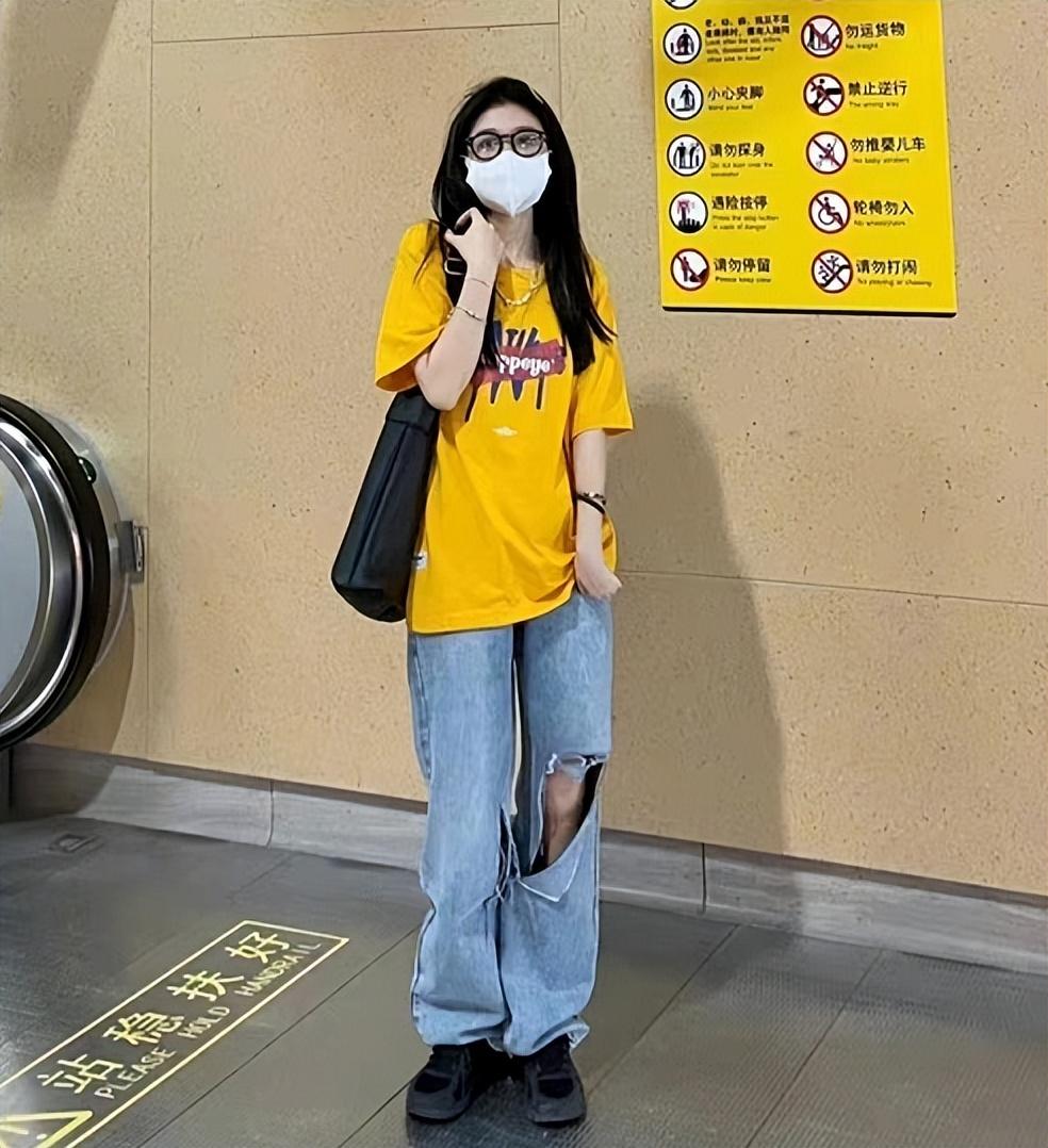 The mango yellow design used in the T-shirt can not only make our skin look fairer, but also perfectly present To bring out the vitality and playfulness of a girl, pair it with ripped trousers with an unruly design. The hole processing and eye-catching color matching are enough to make the look look fashionable and extraordinary.