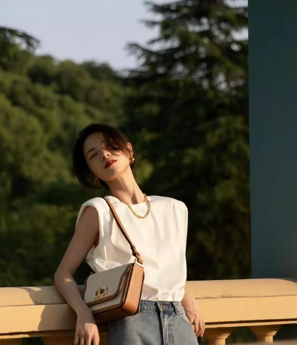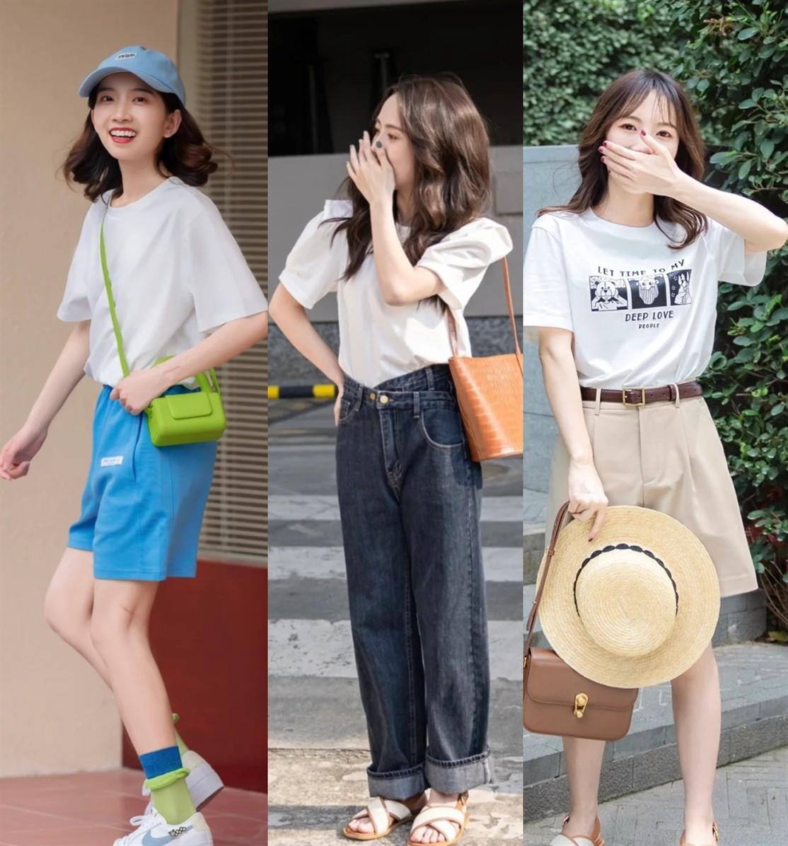 Take a white T-shirt as an example, paired with a green shoulder bag and a blue baseball cap, it looks so youthful and energetic; paired with a brown bucket bag , so simple and elegant; paired with a straw bag, ring and necklace, it is so elegant.