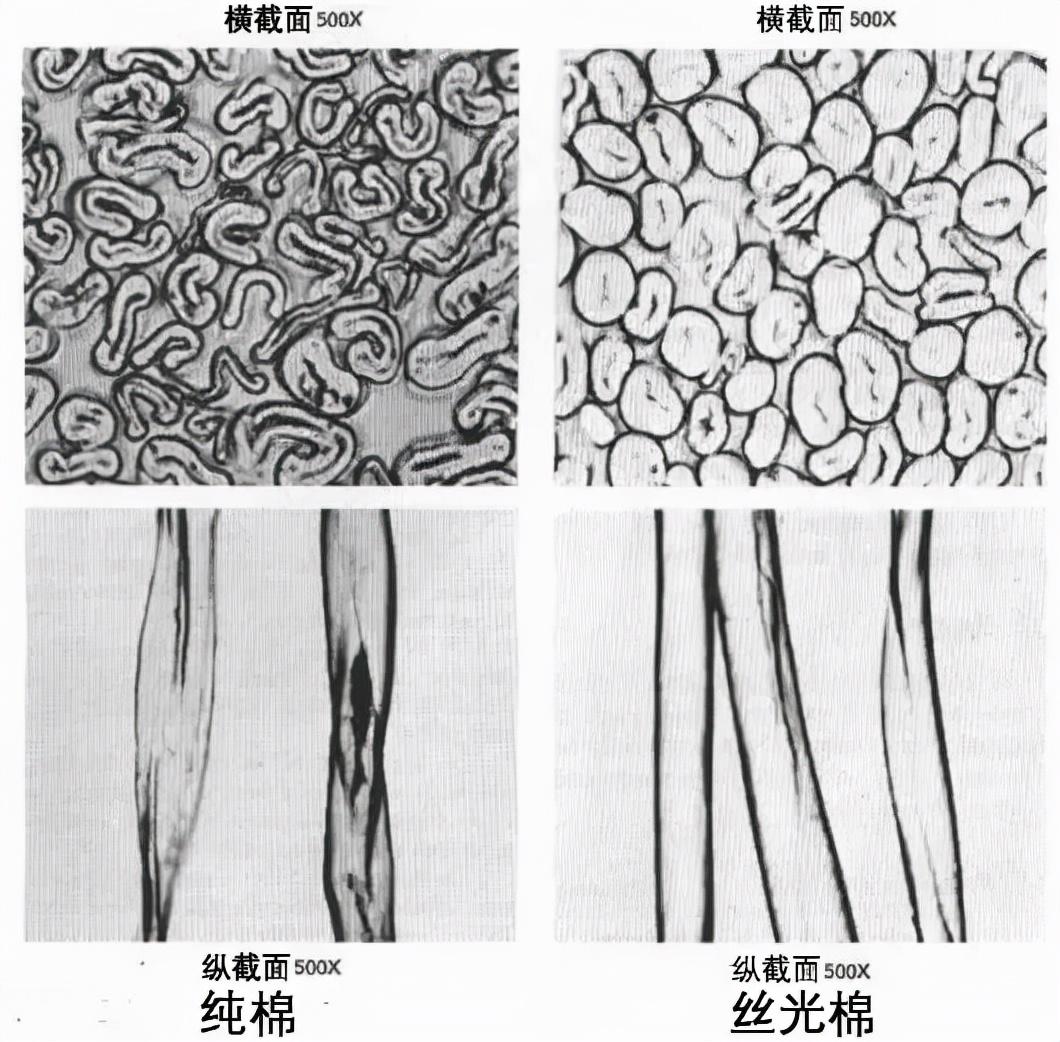 ① Pure cotton horizontal The cross-section is round in shape, and the cross-section of mercerized cotton is round.