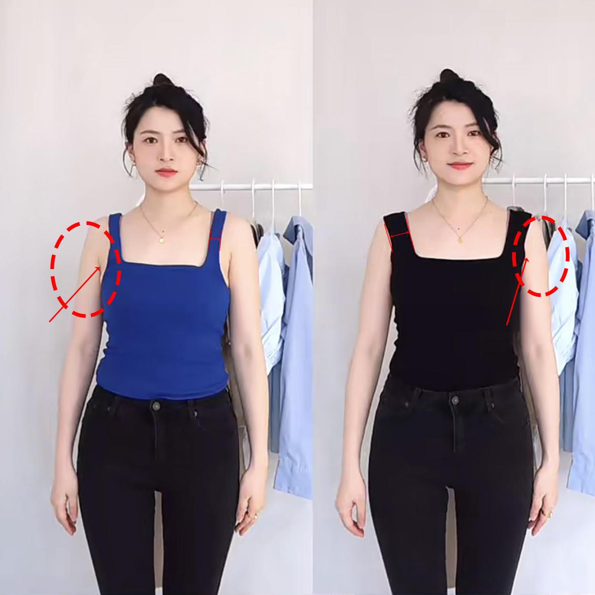 But in fact, it doesn’t mean that you can’t wear slings if your shoulders are fleshy. Many people wear slings to make their shoulders rounder and stronger. This is often due to some differences in details and the wrong style is chosen, which magnifies the shortcomings of the shoulders. It’s obvious when you look at the comparison below.