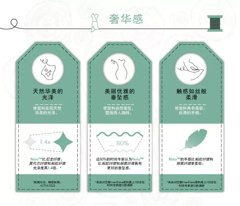 In terms of product life cycle, the bio-based content of Naia™ fiber is 59%, biodegradable (has obtained freshwater degradable certification), and has been certified by a third party The certified life cycle assessment results comply with the ISO 14044 standard, it is an OEKO-TEX 100® Level 1 certified product and is included in the Higg Material Sustainability Index.