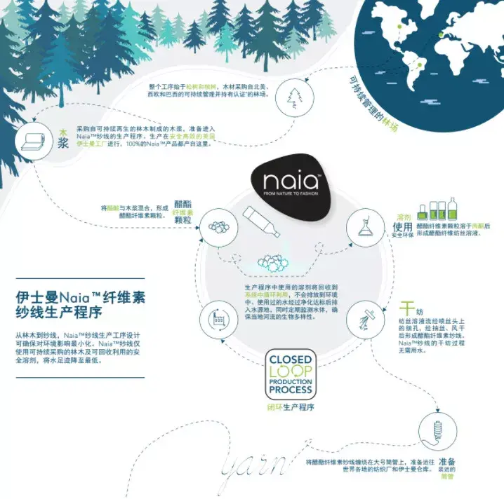 In terms of production process, Naia™ fiber is made by a safe closed-loop process. The solvent used in the process is recovered into the system and recycled, and will not discharge into the environment. The production water is discharged into the water source area after being purified to meet standards, and the water body is regularly monitored to ensure the biodiversity of local rivers.