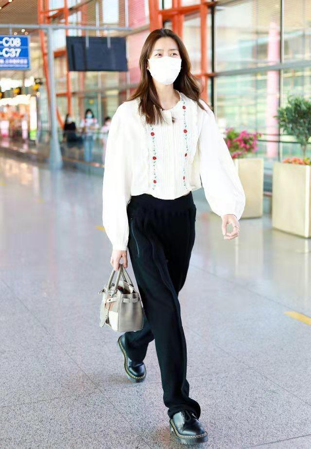 This on Liu Wen This white lantern sleeve shirt is designed to be a fresh and age-reducing style. Some small green leaves and flower patterns are added to the surface to add a spring atmosphere. Paired with black high-waisted floor-length pants, Liu Wen’s tall figure is suddenly lifted. It’s well-depicted and paired with thick-soled round-toe leather shoes, it looks domineering and capable.