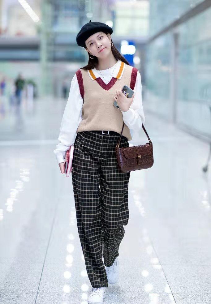 Song Yanfei’s retro-style outfit is so stylish. She chose a camel and red color The spliced knitted vest, paired with a casual white shirt and black and white plaid straight pants, gives people a refined and elegant feeling. She wears a black beret on her head, which makes her face look even better. For being petite.
