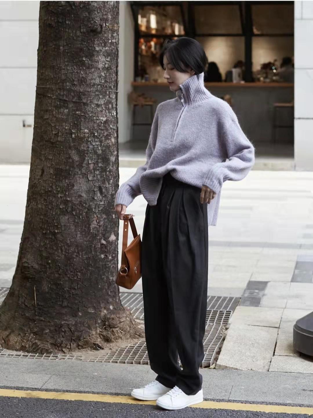 Gray pants outfit:Pair it with textured basic design items to be comfortable while exuding a touch of French laziness. The top is a gray-purple zippered turtleneck sweater, The zipper high collar design is really not too much Excellent, the lower body is a classic combination of gray suit pants + white sneakers, which instantly injects a very formal outfit with a French leisure soul.