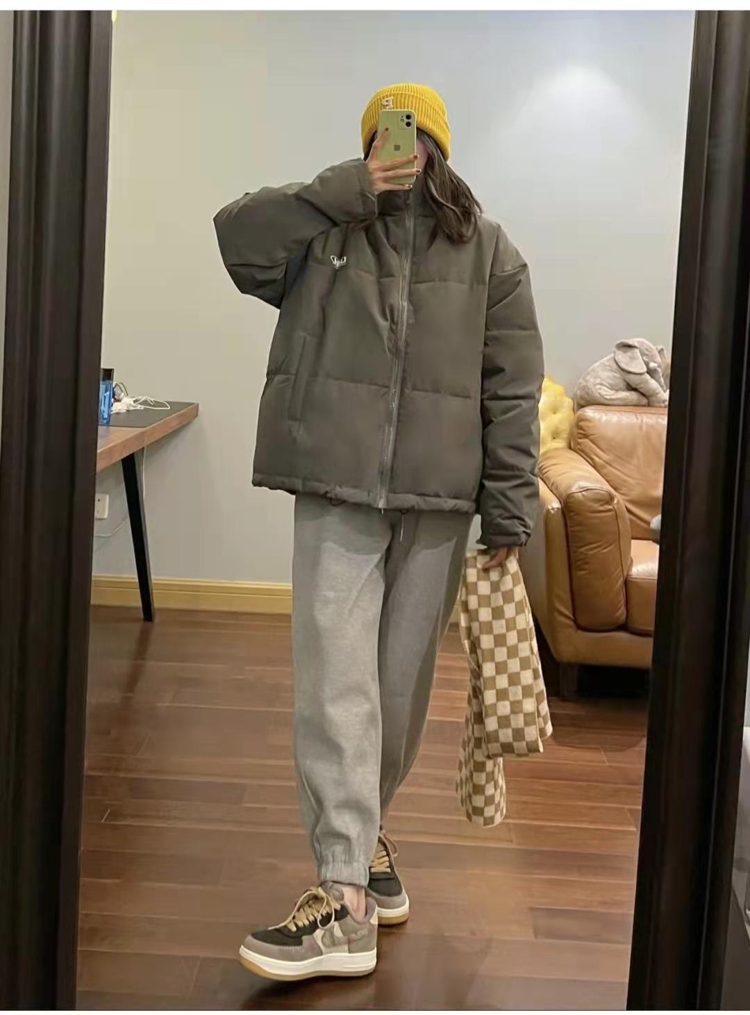 Gray pants outfit: Gray down jacket Boyfriend style is very safe and is a genderless style. This gray texture is full of texture, and it goes well with the gray leggings sweatpants. It has a Korean street style. It would also look great if paired with black shark pants and white mid-calf socks.