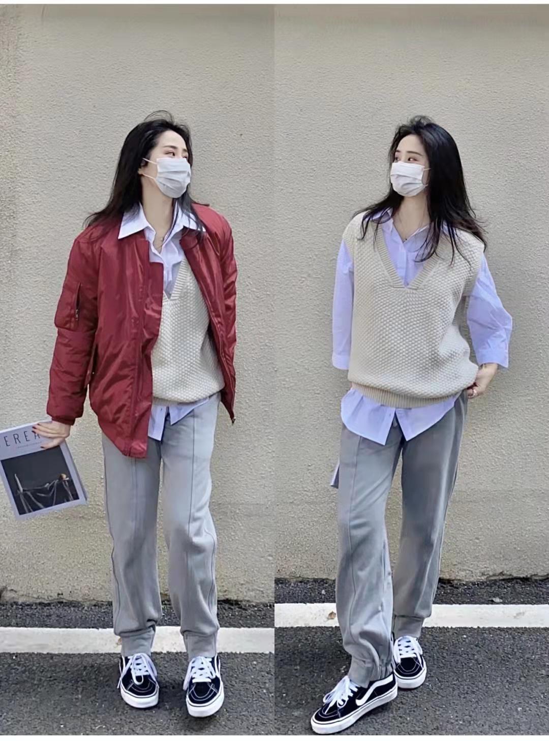 Gray pants outfit:I like this rust red flight jacket. The fabric is very windproof. If you think the neck is empty, you can wear a thick scarf. It is worn with a beige vest and a blue shirt. The deep V-neck vest lengthens the neckline. The inner wear has a sense of layering. The sweatpants on the lower body are made of thick material and the color is a special lime gray. On the feet are classic Vans sneakers.