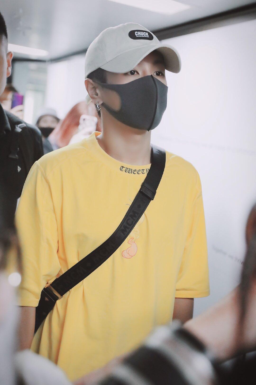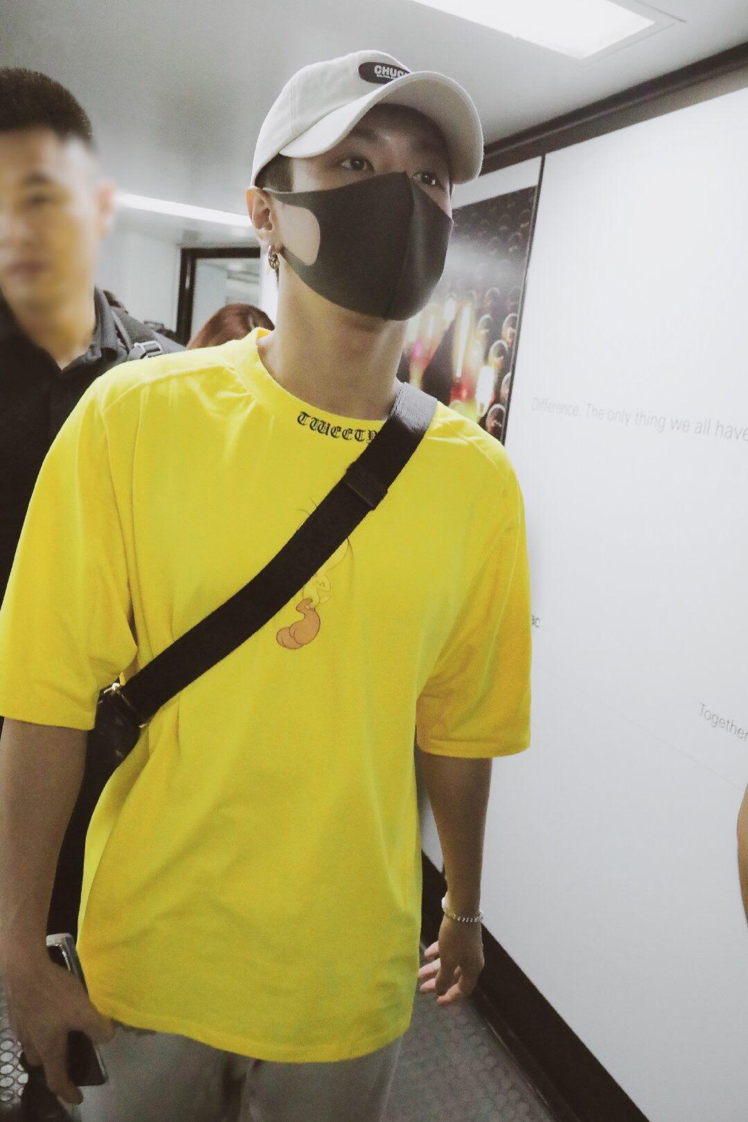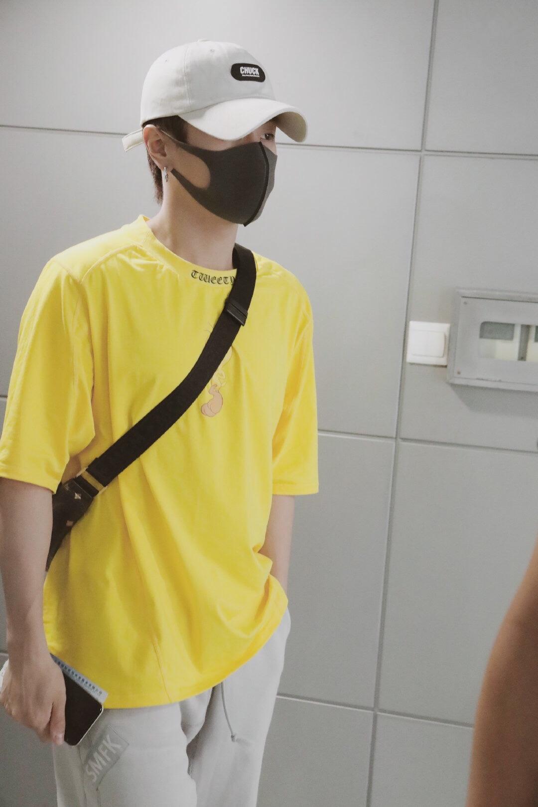 Li Wenhan appeared at the Shanghai Airport in a casual outfit, exuding youthful vitality. He chose a bright yellow T-shirt decorated with cartoon patterns. The circle of characters on the collar added a touch of coolness to him, giving him a very summer feeling overall.