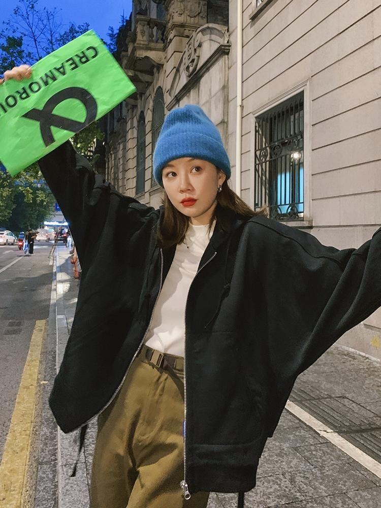 2. Light solid color zipper sweatshirt + dark blue loose straight denim