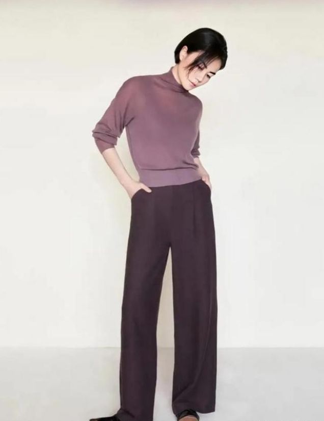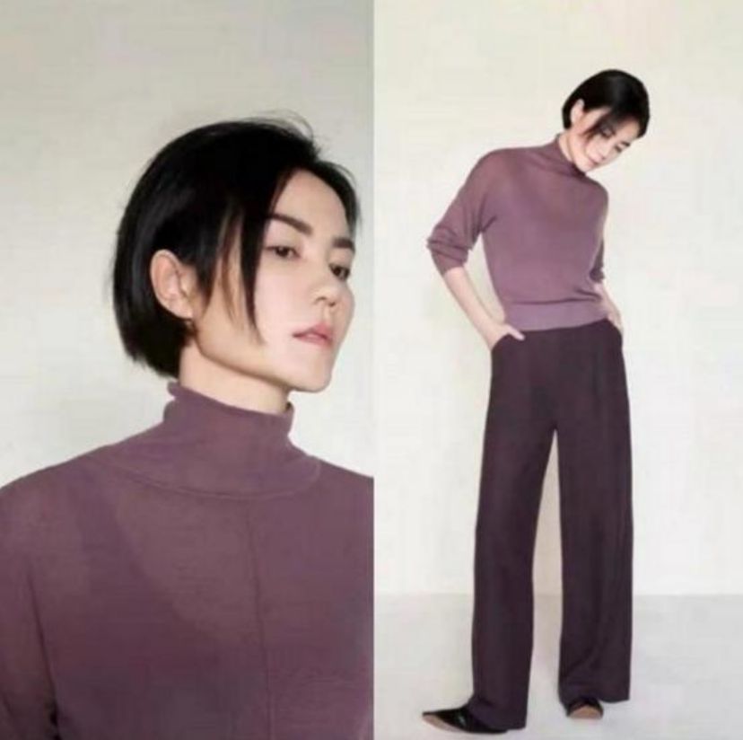 The combination of suspenders + purple sweater in Faye Wong’s look has a certain degree of see-through. You can vaguely see the outline of your figure, making it even more slender and charming. This kind of matching is also very friendly to women with “bye bye flesh”. The outer shirt can It plays the role of modifying the figure. Choose dark-colored inner wear to look very slim visually. Paired with a basic bottom, it looks very simple, but full of fashion.