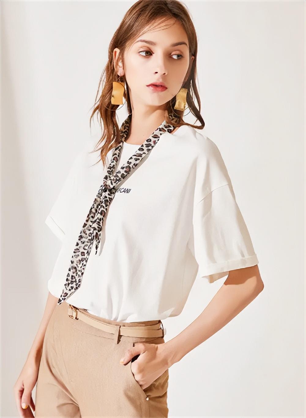 Adding a silk scarf to a T-shirt that looks like a blank drawing board is a great way to create a new look. Your unique personality.