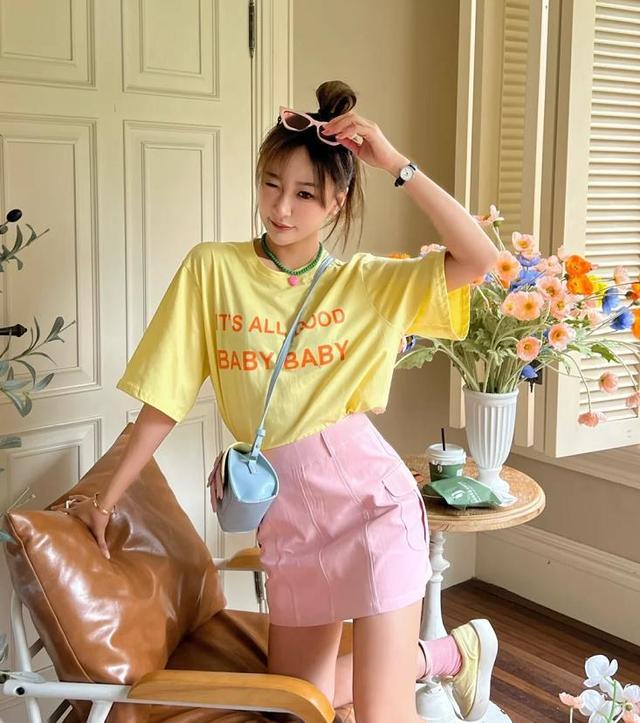 Look at this macaron color outfit, isn’t it too fashionable and eye-catching? The eye-catching yellow short-sleeved T-shirt + pink skirt is very girly!