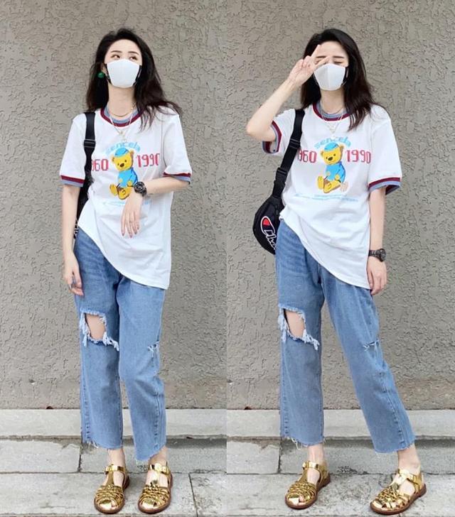 A very good-looking and comfortable set of T-shirts. The clean white printed short-sleeved T-shirt is not as single as a solid color. The printed design of cartoon patterns on the chest adds to the fun. Coupled with the contrasting color design on the cuffs and collar, it’s quite discreet, right? In addition, the lower body is matched with a pair of ripped denim straight pants. It really doesn’t want to be too fashionable and individual.
