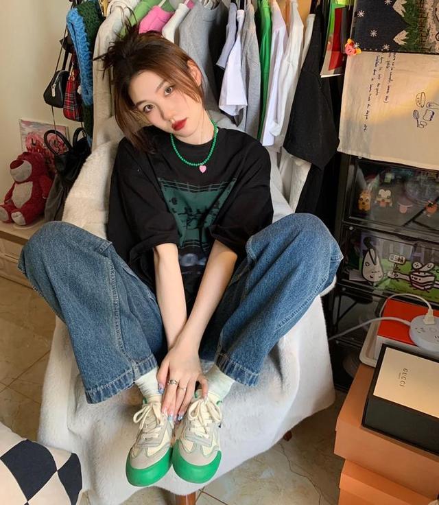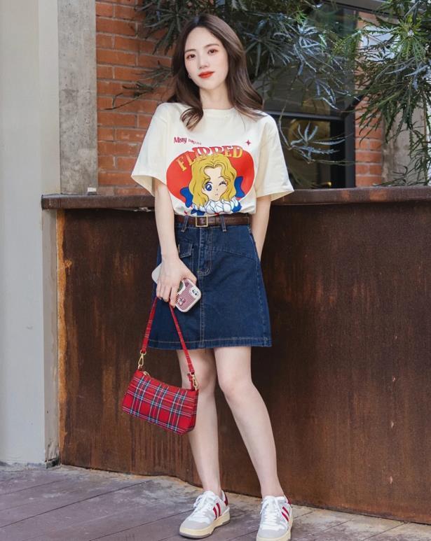 If you want to wear an ordinary T-shirt with a fashionable and age-reducing effect, then Wear it with denim items, either with jeans or a denim skirt. Short-sleeved T-shirts with retro cartoon patterns are much more fashionable and interesting than solid-color ones, right? The fit is loose, so it is very casual and comfortable to wear, and it can easily hide the shortcomings of a thick waist and a small belly. The denim skirt paired with the bottoms creates an age-reducing and youthful look for the entire outfit!