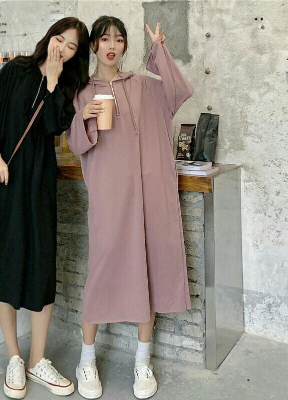 The first sweatshirt is a style that we don’t usually see often. It is long and almost reaches the ankle. One advantage of this kind of sweatshirt is that you no longer have to worry about matching the lower body. It is directly equivalent to a suit that replaces everything. It’s just that wearing it will put some pressure on small children, as it will suppress their height and fail to modify their body proportions. But for tall girls, all this is no problem, and they will also bring out some extra aura.