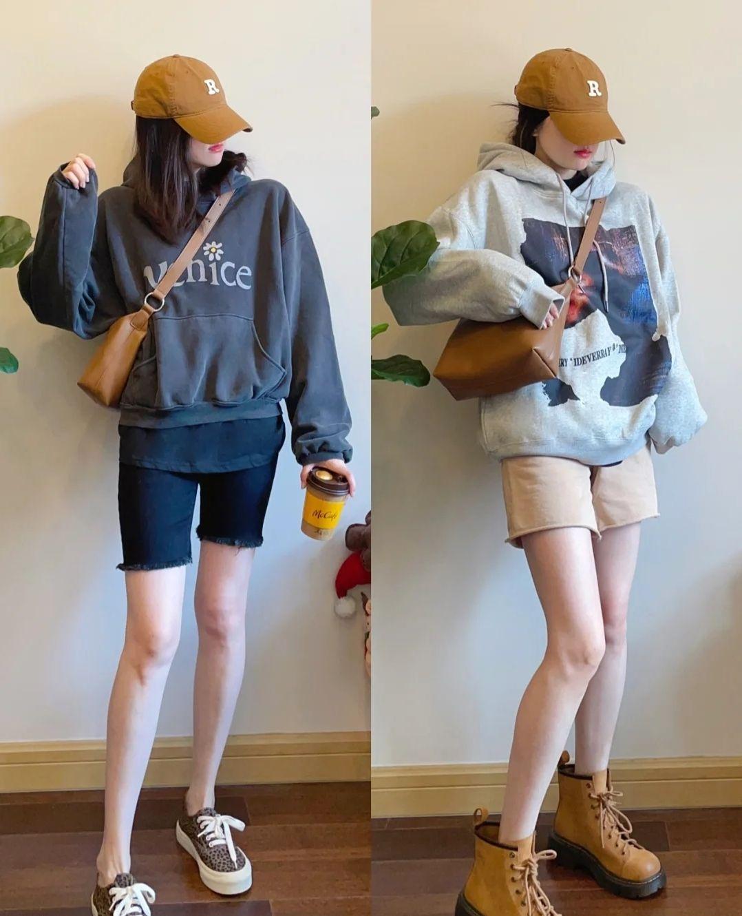 When wearing a sweatshirt, you can pair it with shorts on the lower body. Use a loose-fitting top and a long top and short bottom to create a visual focus and highlight the superiority of the leg shape.