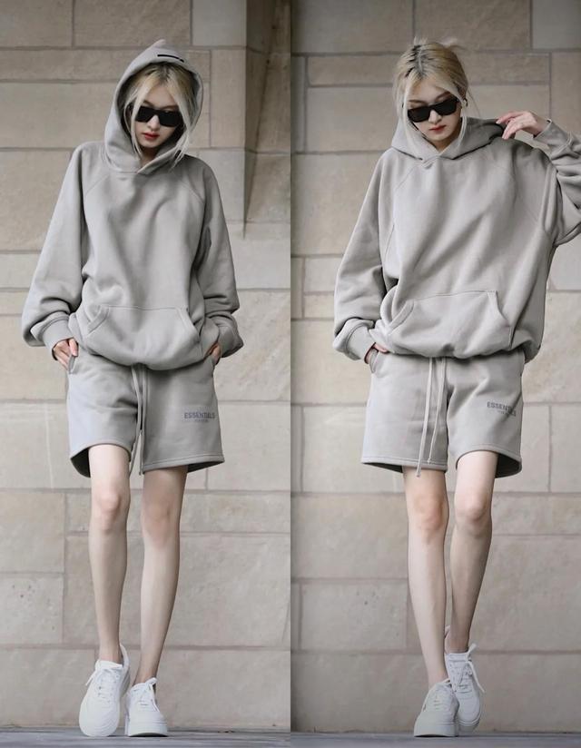 Sweatshirts of the same color are paired with shorts. The overall color presentation is simple and low-key, and the harmony of color matching is strong enough. The shorts on the lower body are designed in a looser design to echo the sweatshirt on the upper body. The overall matching effect is Provides sufficient comfort.