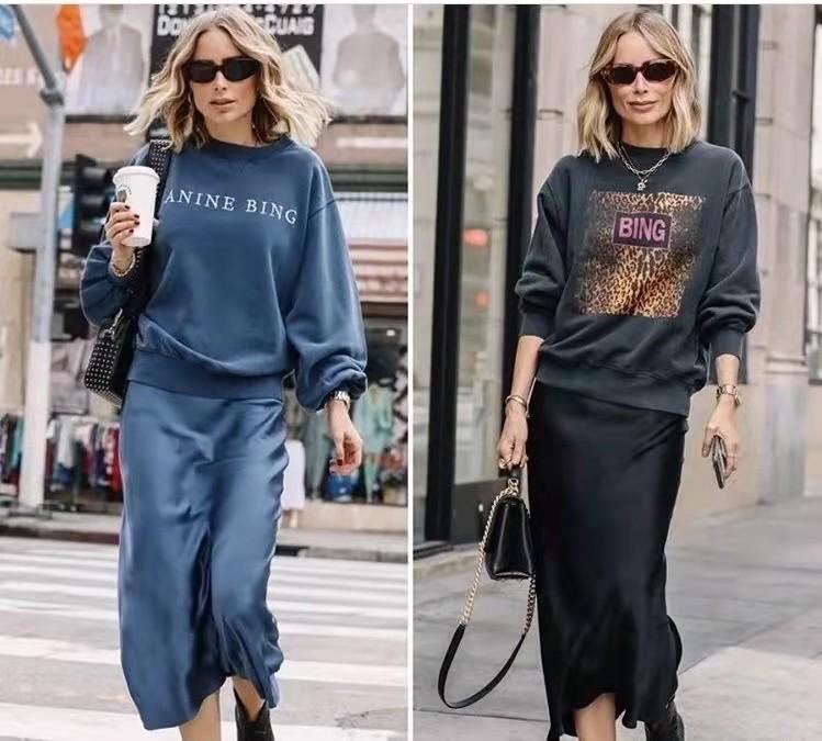 If you want to look high-end and elegant as a mature woman, you can use a basic dark sweatshirt with a satin skirt of the same color and wear the satin skirt on your body It can not only ensure sufficient comfort and skin-friendly feeling, but also show the effect of brightening the skin tone through the slightly sparkling design on the satin fabric.