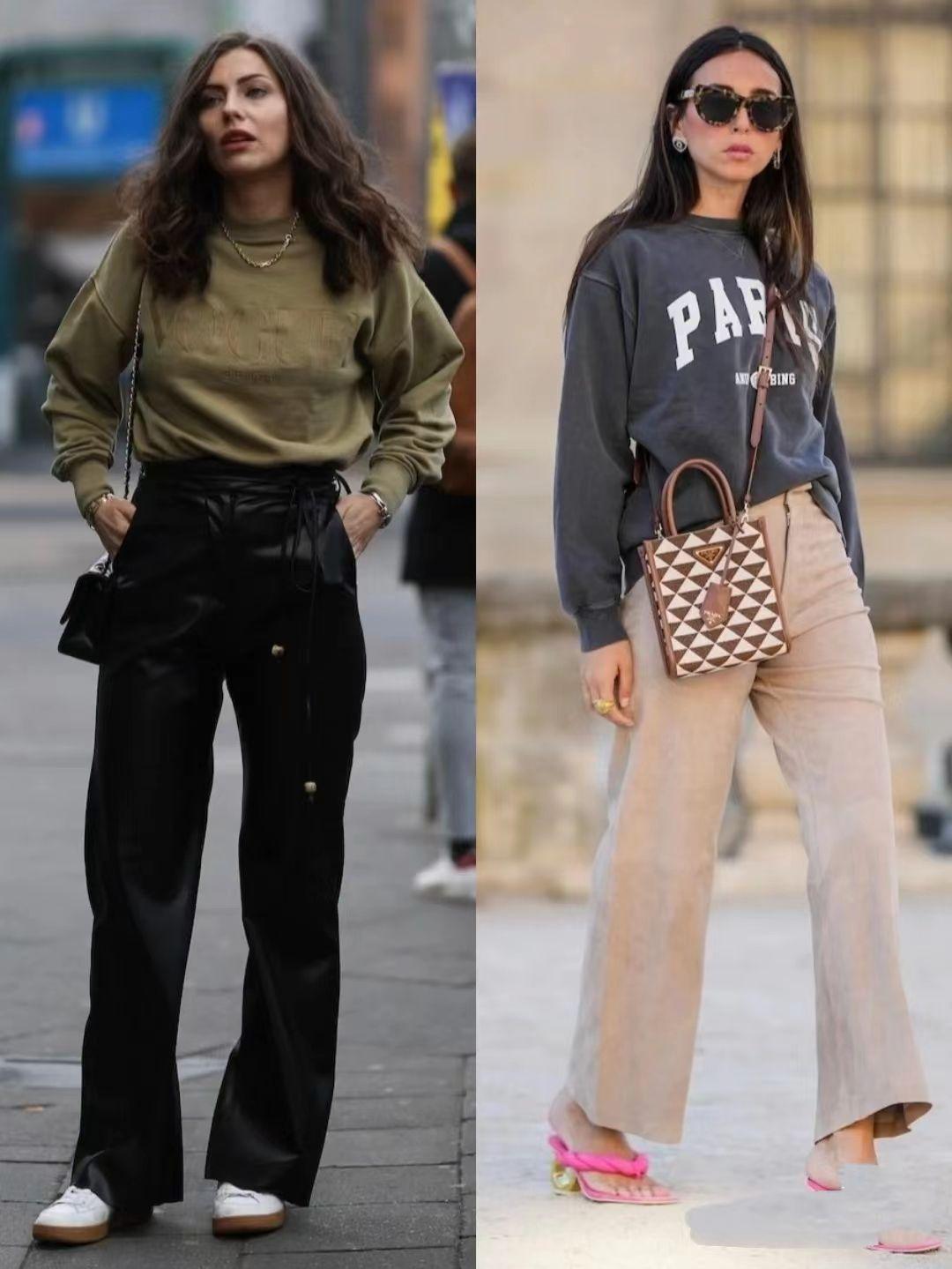 Sweatshirt and trousers The matching method is also very common in autumn street photography. On the one hand, it is simple to keep warm. On the other hand, a short sweatshirt and high-waisted trousers can easily create a three-to-seven ratio and create a comfortable and casual street look.