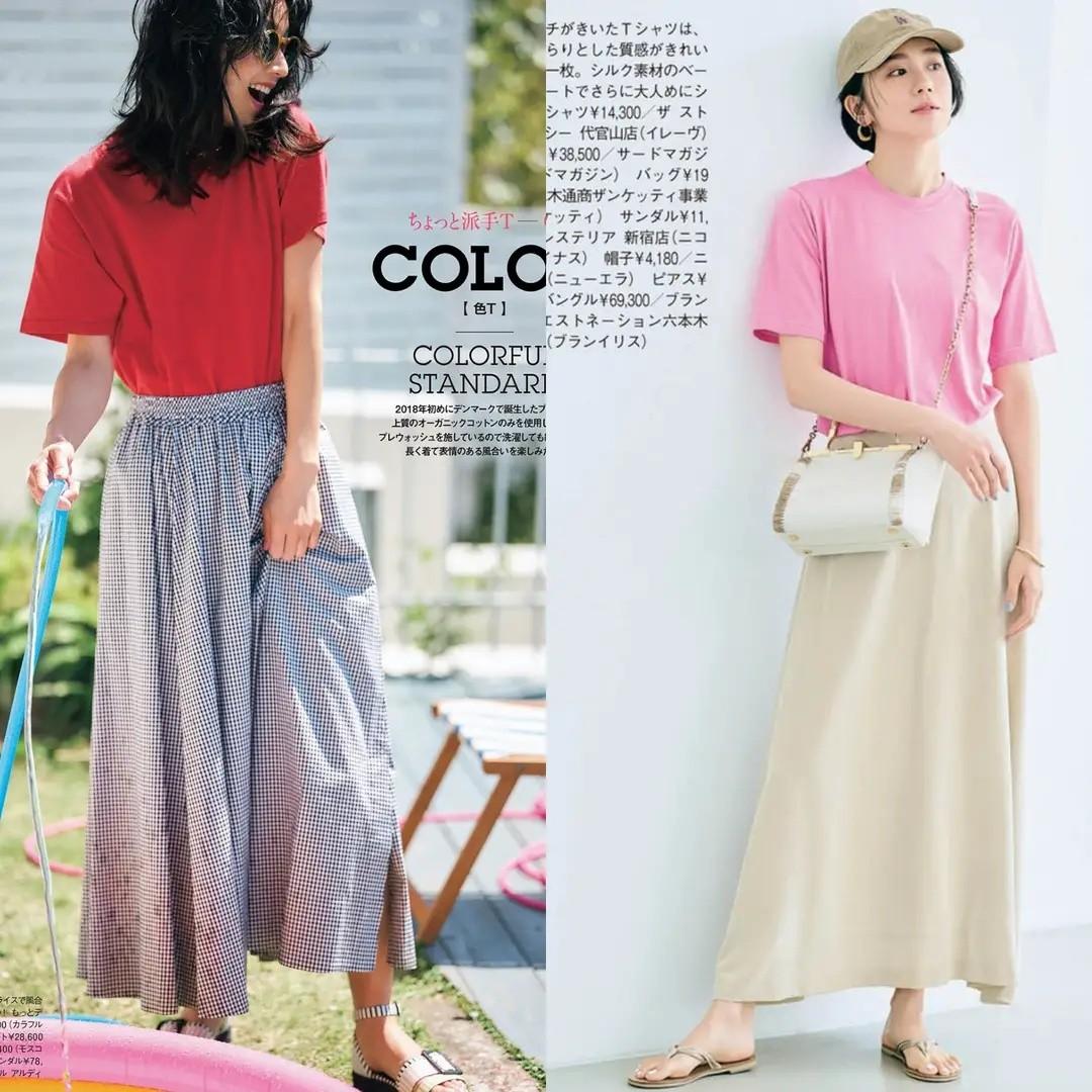 When matching a T-shirt with a skirt, you must understand the role of the waistline. The height of the waistline must be high to show the effect of lengthening the legs. Therefore, everyone should use a short T-shirt when matching. Pair it with a high-waisted midi skirt to raise the waistline, thereby creating a matching effect that makes your legs longer and more elegant.