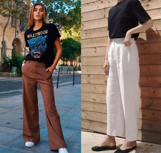 A black T-shirt paired with wide-leg pants is full of aura, and this combination is not body-conscious. Small girls can tuck their pants into their pants. For tall girls who have elongated their body proportions, their T-shirts hang down, making them casual and stylish.