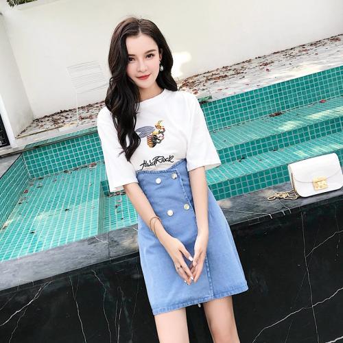 In addition to choosing high-waisted shorts and T-shirts, choosing high-waisted skirts and T-shirts is equally beautiful and tall. Let’s take a look at this set of matches. The upper body is a printed white T-shirt, and the lower body is a high-waisted denim A-shaped skirt. The whole outfit is tall and thin, and can be worn to look young and energetic. It feels like summer. The plaid skirt with white letter T and plaid high-waist style also looks very good, and the whole outfit looks very pure and young.