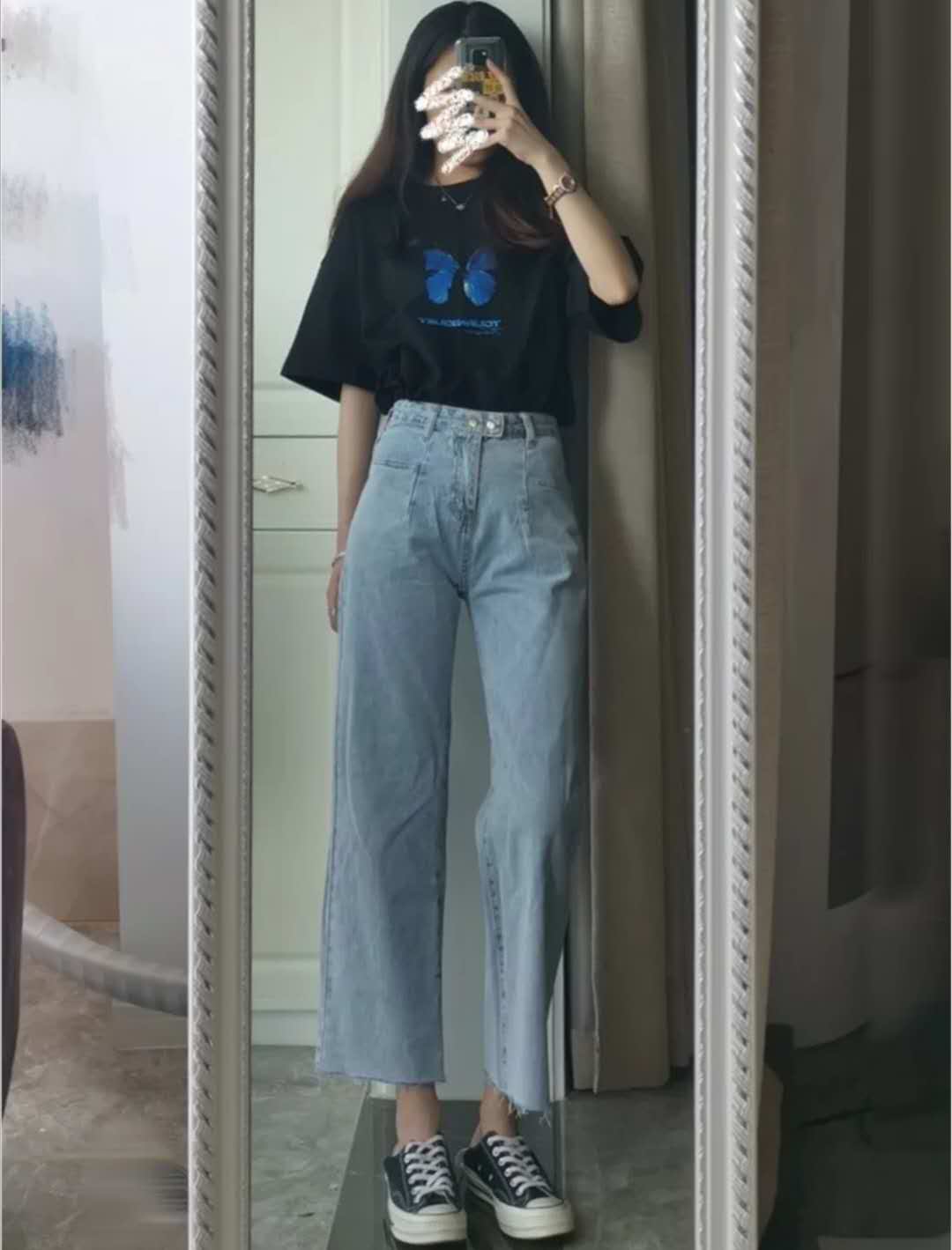 The weather is starting to get hotter Everyone, remember to drink more water to replenish your body and wear a cool black T-shirt. The butterfly print on this black T-shirt is beautiful. Pair it with light-colored wide-leg jeans. The fabric of the jeans is very thin, so it is not boring to wear in summer.
