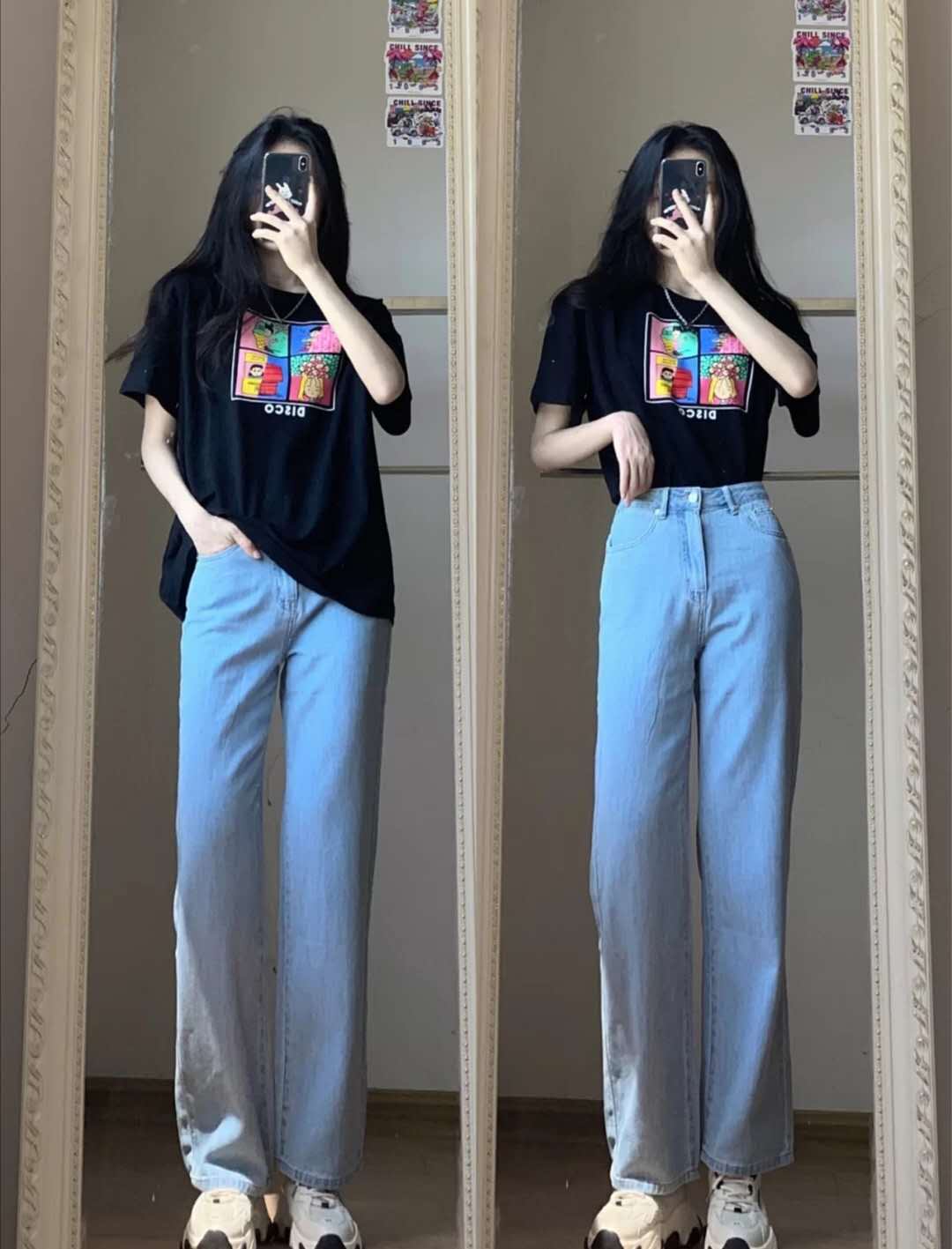 The one above the black T The four-frame interesting pattern print adds color to the black color. It is a clever combination of retro and trendy cool. The material is very breathable and will not be boring if worn in summer. I like this disco pattern, it is so cute. Blue wide-leg jeans are another pair of pants with a great fit. They make your legs look slimmer and longer, and they are not made of thick denim fabric. They are no problem to wear in summer and can completely cover up the shortcomings of straight legs.