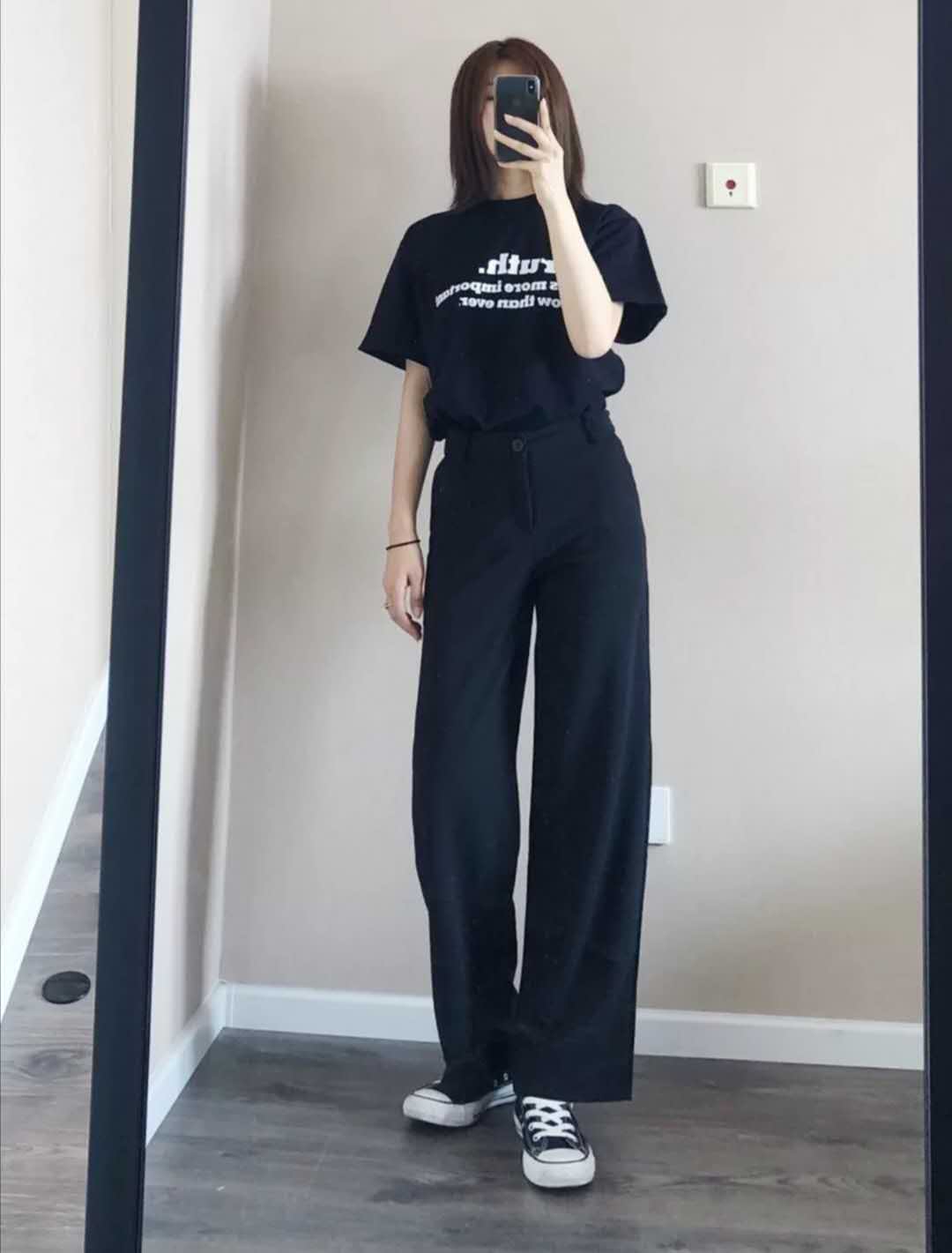 All black outfit, attitude T-shirt + black suit pants + canvas shoes. This kind of pants is really reminiscent of when you were about to graduate from college. Everyone was discussing how to buy professional attire. They look too much like office pants, so don’t wear leather shoes, otherwise you will pass by an office building. , you will be sucked in to do the work!