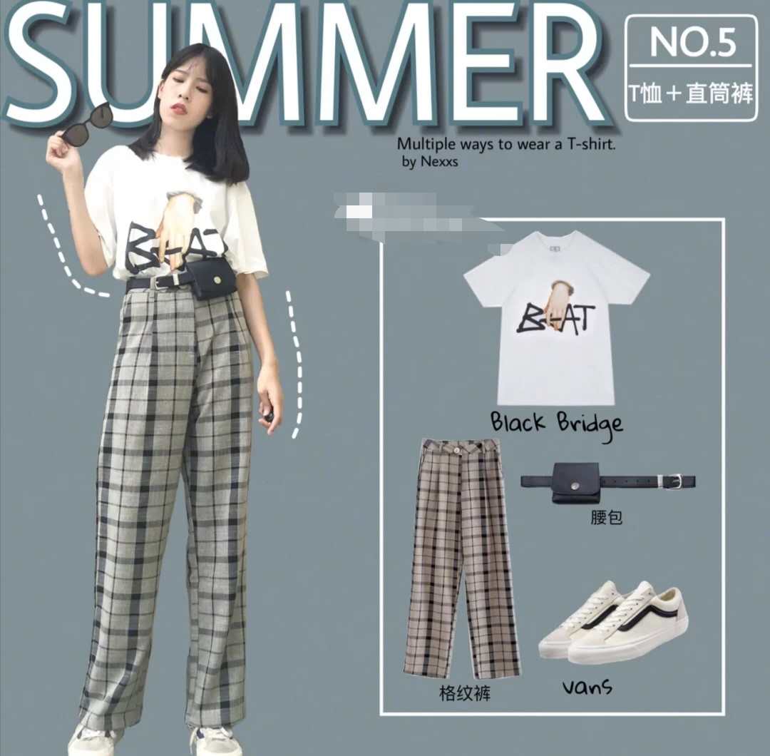 High-waisted straight pants have been popular in recent years. Because it shows long legs and is very tolerant, paired with the enduring plaid element and embellished with a waist bag, this set can also be worn with a coat in autumn and looks great.