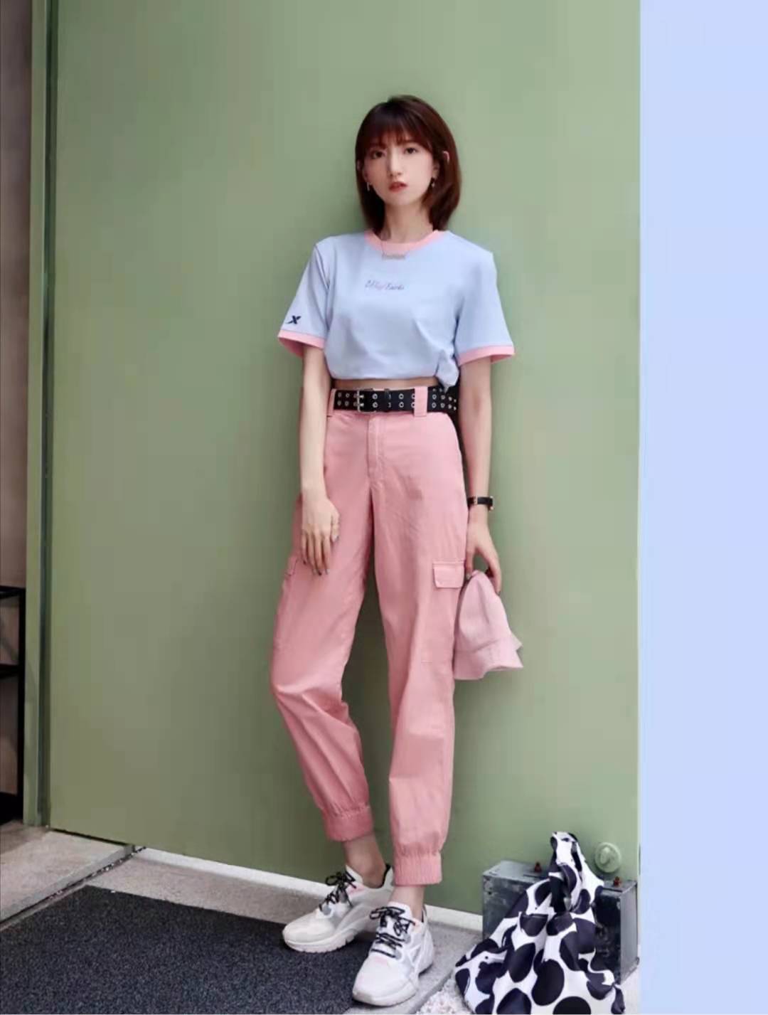 The milk blue T-shirt is simply eye-catching and paired with a pair of pink overalls. The T-shirt can be rolled up and worn into a short top. Paired with high-waisted pants, it is cool and sweet. There are many colors of T-shirts, so choose from Wear a flirty pink blue and add a black belt to the pants to match the black on the shoes and bag.
