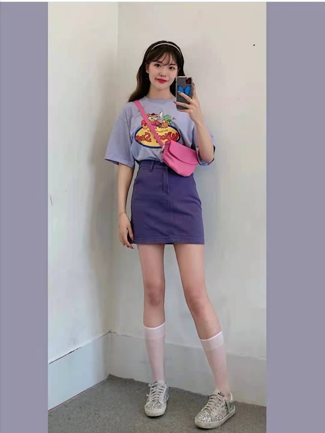 The color combination of this outfit is very harmonious. The top is a purple printed T-shirt, which is a very cute style. The lower body is matched with a purple skirt, and the skirt is short and tight. Style, sexy and showing off your figure at the same time, wearing very popular calf socks + sneakers.