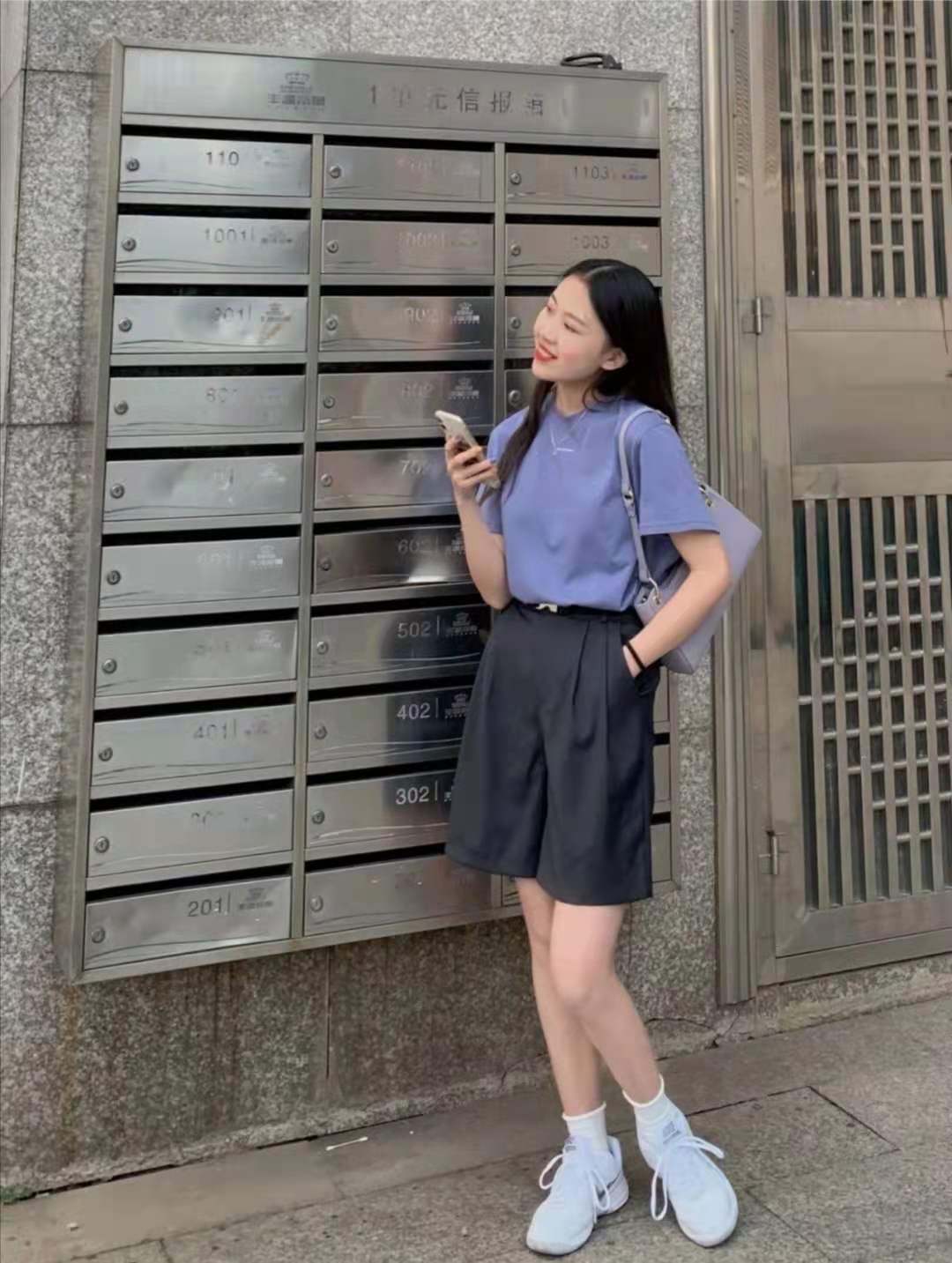 look8 blue and purple T-shirt+grey mid-pants+ White sneakers