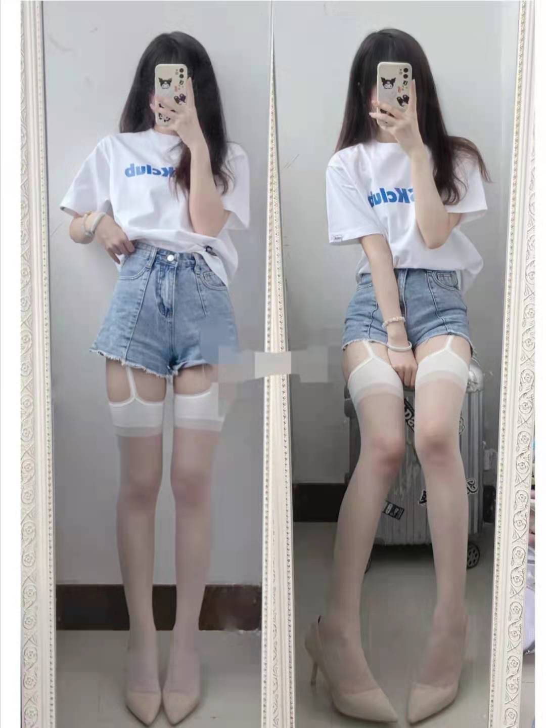 This outfit is pure lust. The top is a simple white T-shirt. The letter style is simple and fashionable. The lower body is paired with light blue denim shorts, which are very popular this year. The garter lace stockings are white in color, and she also wears nude high heels on her feet. The overall outfit is very sultry.