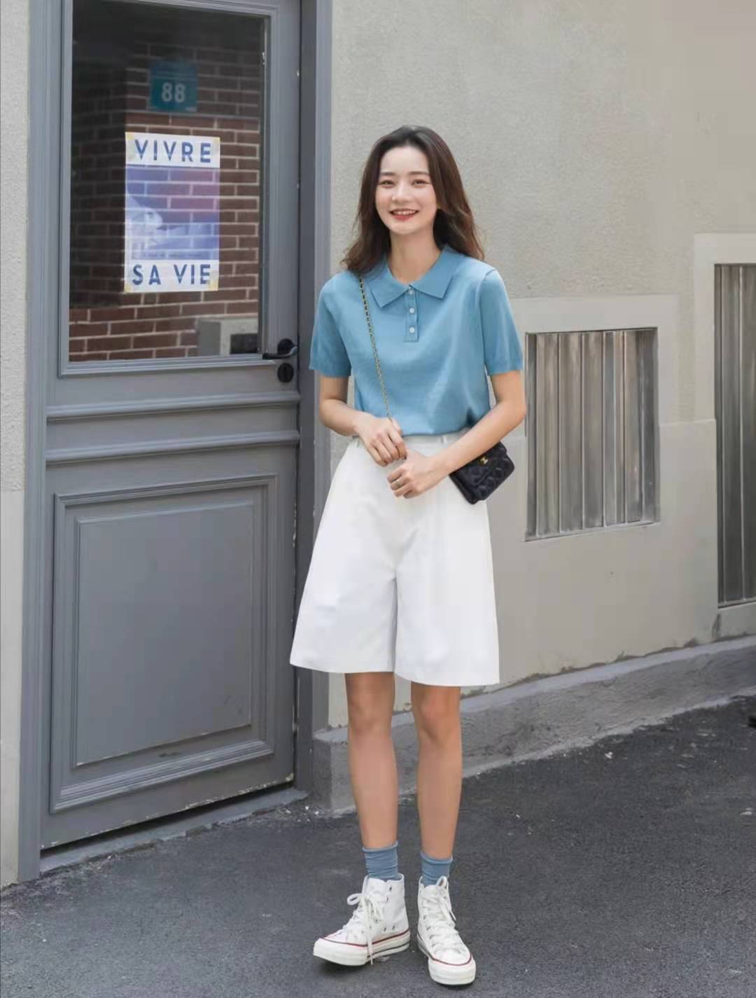 Refreshing blue Polo shirt, the upper body is very white, and the white pants on the lower body match well. It is a small A version, which is more tolerant and slimmer than the straight version. , paired with a pair of canvas shoes + blue socks, the overall look is very rich, full of vitality and coolness, sassy and casual, and a very attractive set.