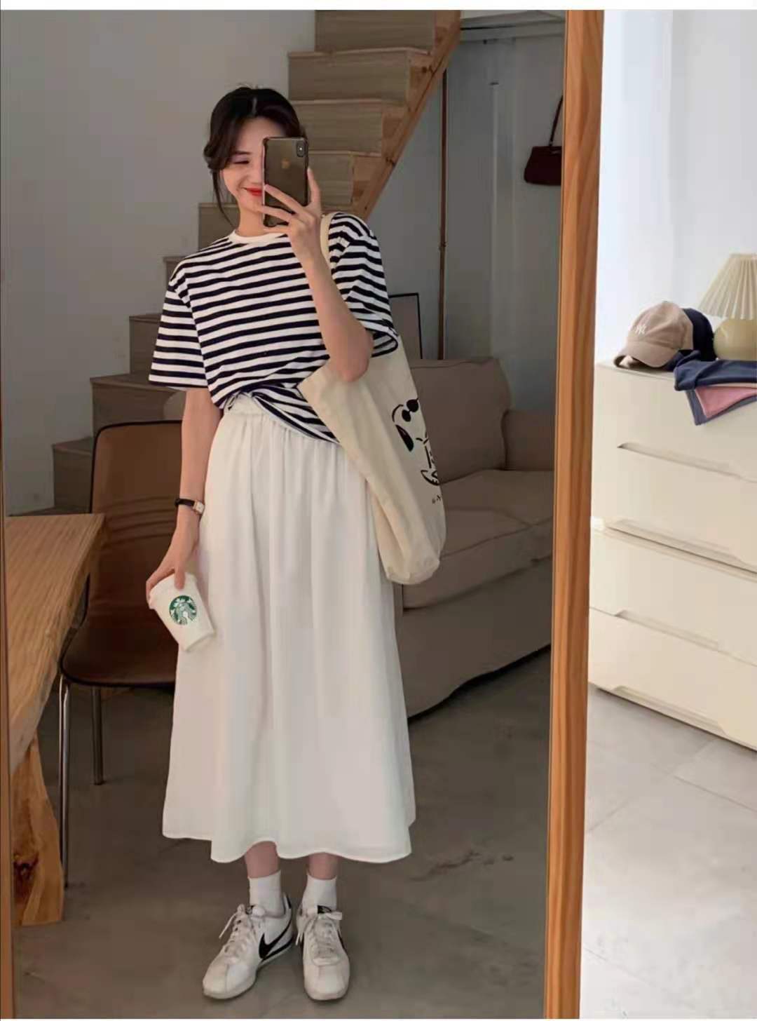 This Korean girl is wearing a classic striped T-shirt that is easy to wear and fashionable. The lower body is matched with a white high-waisted skirt. The skirt has an elastic waist style and a high-waisted A version umbrella. Skirts are particularly easy to wear and can be worn by both fat and pear-shaped sisters.