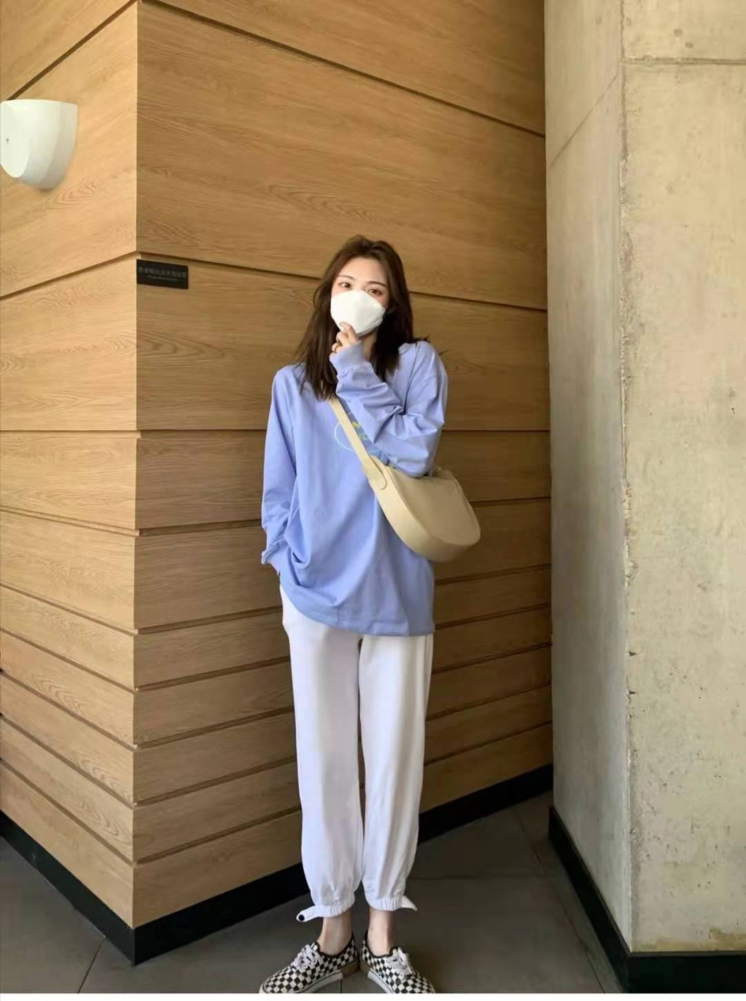 Lazy and casual, not Picking a figure, purple and white look great. The T-shirt is very white and feels good. The white leggings have not only snap buttons but also zippers on the trouser legs. They are super practical and good-looking. The checkerboard pattern on the feet is comfortable and fashionable.