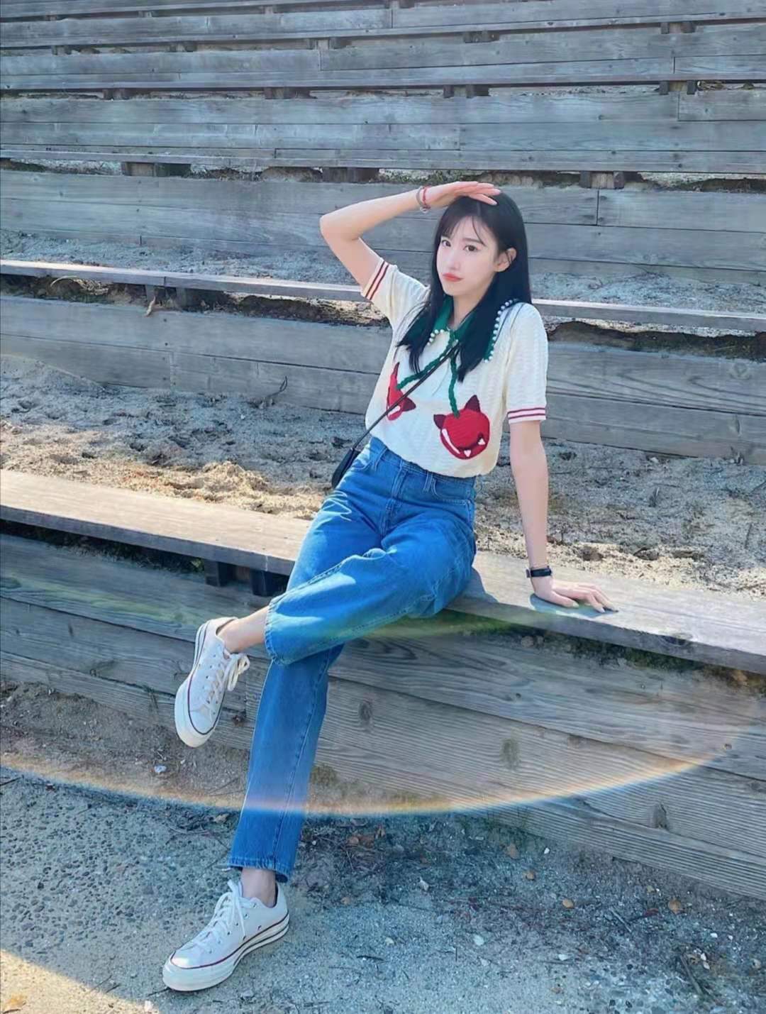 This pearl T-shirt is too It’s interesting, it’s full of playfulness. I like the devil + cherry design. It’s so cute. It’s casual and age-reducing. With the pearl elements, it’s a high-end dress. The lower body is paired with blue denim high-waisted straight pants + white Canvas shoes.