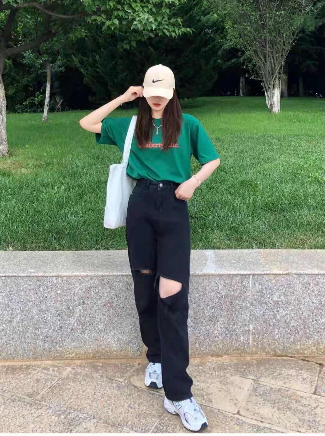 Summer T-shirt outfit: This is a relatively neutral outfit. The green half-sleeved T-shirt on the top is made of soft cotton and can…� Taking into account both coolness and texture, the ripped wide-leg pants paired with the lower body are good news for people with thick legs. They can cover the shape of the legs and are super breathable and cool.