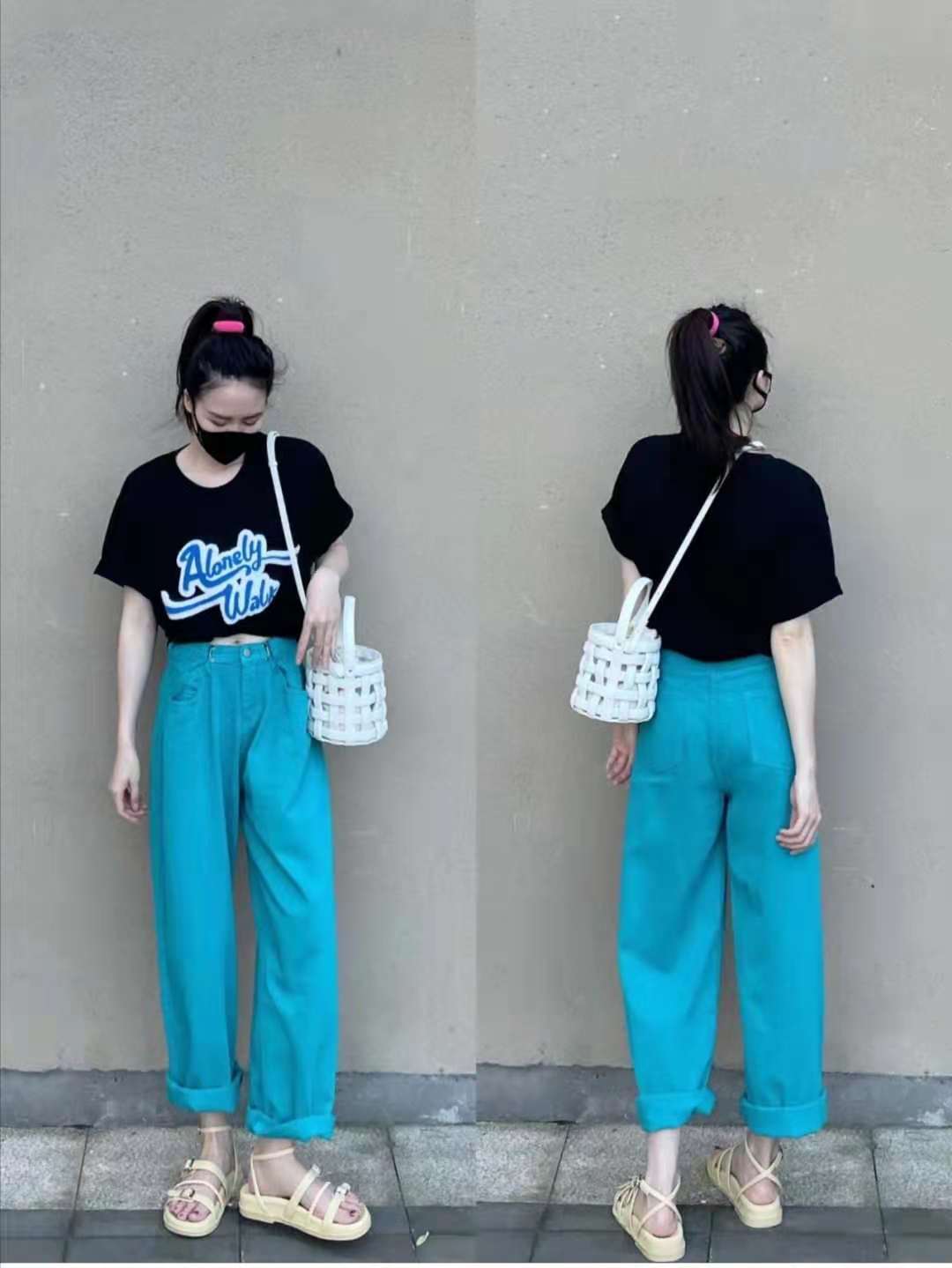 Summer T-shirt outfit: This is a vibrant summer outfit. The top is a classic and versatile black T-shirt with half sleeves. I like the blue letter print on the chest. It goes well with the trousers on the lower body. The trousers are blue. Thin jeans and wide-leg pants, which are refreshing and comfortable. Roll up the trouser legs to expose the ankles and match them with green strappy sandals.