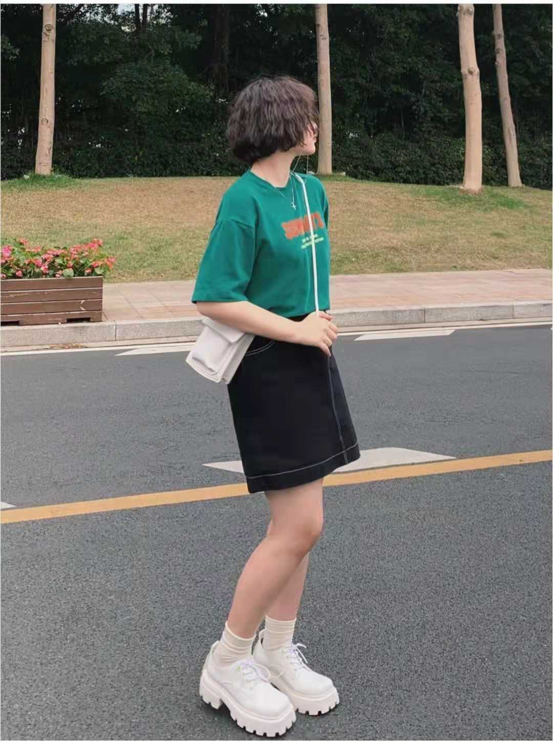 Summer T-shirt wear: This is the standard summer outfit for fat women. The green half-sleeved T-shirt she is wearing is a slightly loose body. The cotton upper body is slim and comfortable, and the lower body matches The black A-line high-waisted denim skirt is a basic skirt for fat women. The overall green and white look is refreshing, so it is paired with a white bag and thick-soled leather shoes.