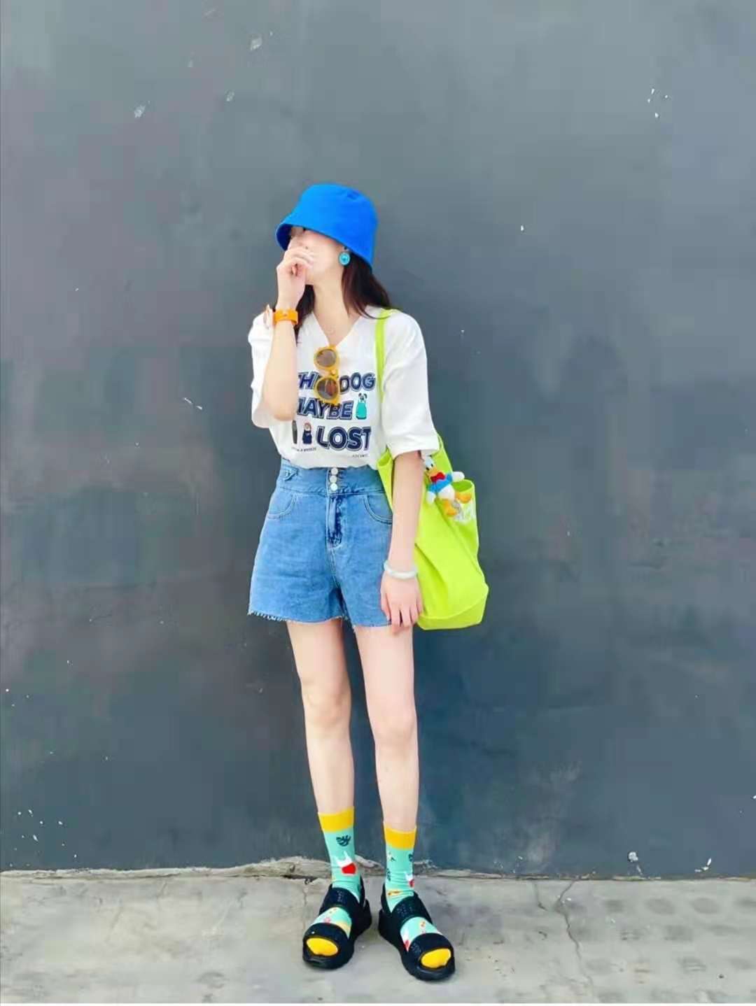look8 white printed half-sleeved T-shirt + washed blue high-waisted denim shorts + colorful socks + black sandals