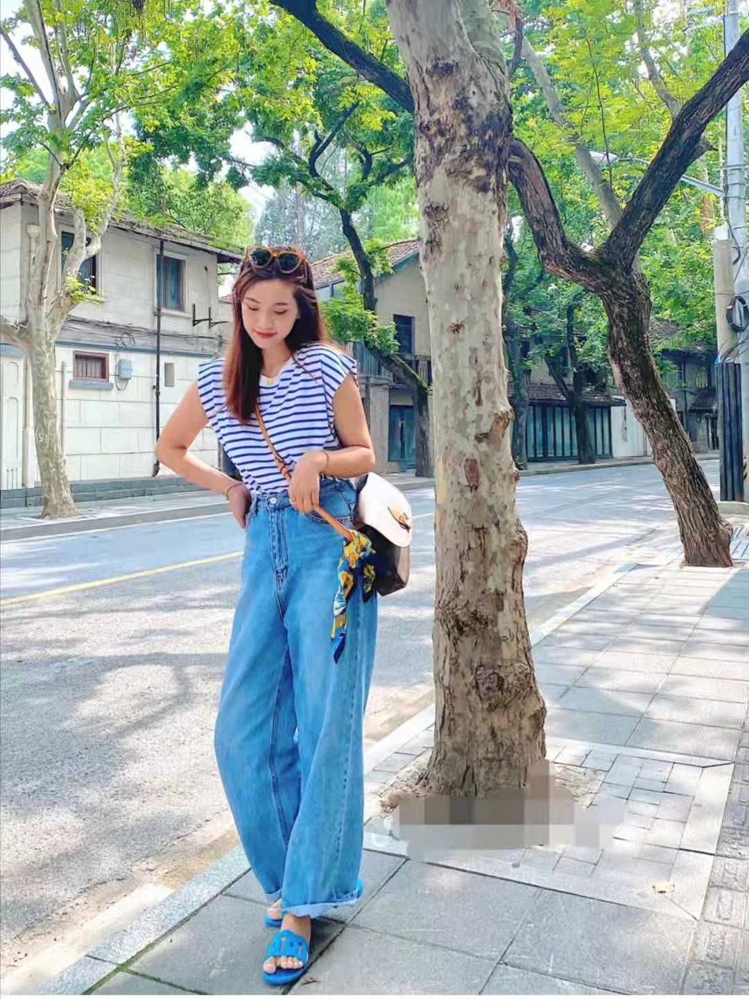 Summer T-shirt wear: The blue and white striped design is really fragrant, the fabric has good texture and is very comfortable to wear. The half-sleeve design can cover some arms, and the cuffs are a little loose, so you need to wear a base layer; this one for the lower body My favorite is blue denim with wide legs. The length of the trousers can be adjusted by cuffing, and the straight-leg trousers can be worn for a loose feeling.