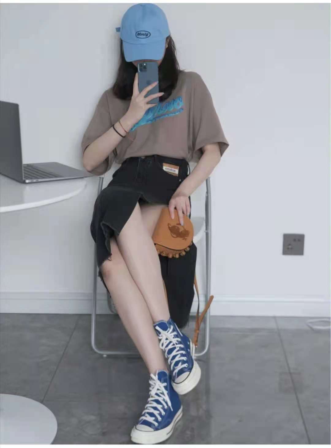 Summer T-shirt outfit: This contrasting color of blue, black and brown is a bit high-end, sweet and cool. The brown half-sleeved T-shirt on the top is a color that can also be worn in summer. The lower body is matched with charcoal black The jeans have a clever design with slits on the side, making them appear whiter and slimmer. On their feet, they wear blue high-top canvas shoes and a peaked cap to match.