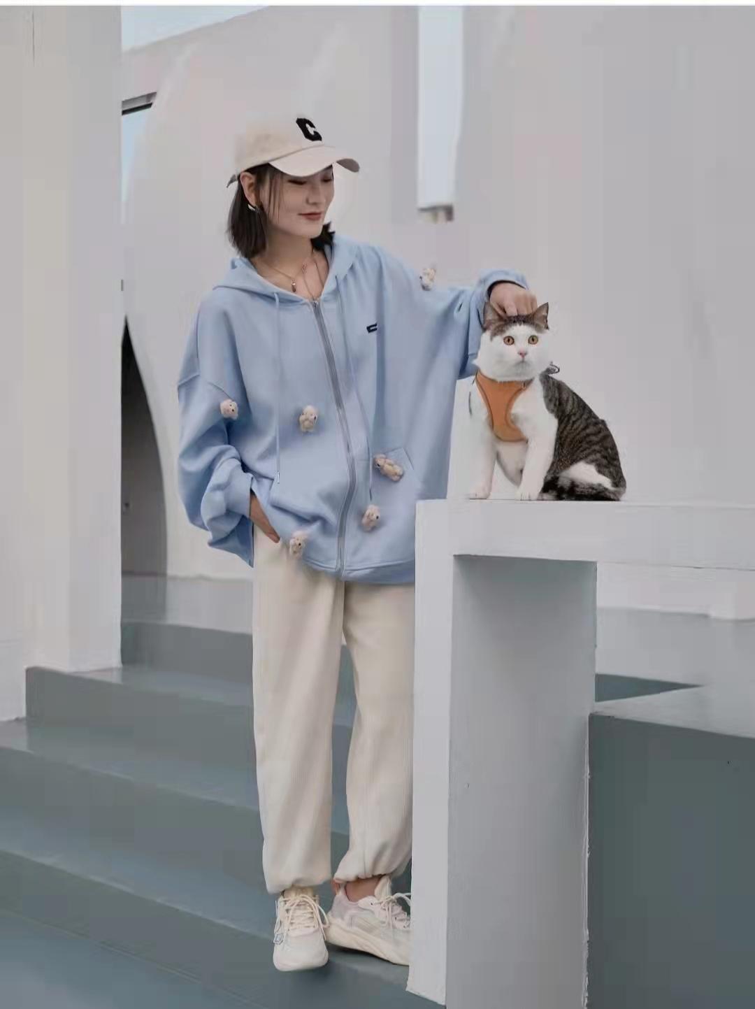 Sweatshirt outfit:Casual and comfortable sweatshirt, sweatpants and sneakers, baby blue cardigan sweater with many little bear dolls crawling on it, cute and headless, paired with beige sweatpants, all loose The shape is visually very slim, and the shoes are also matched with beige colors, which feel soft and comfortable when worn.