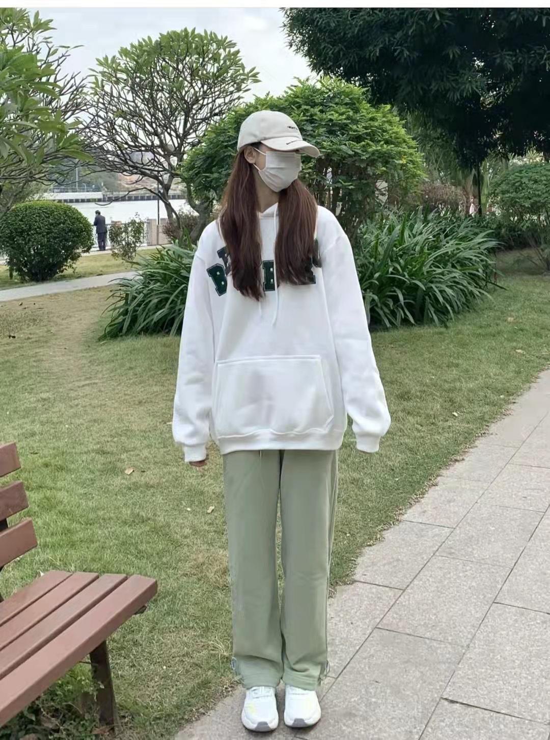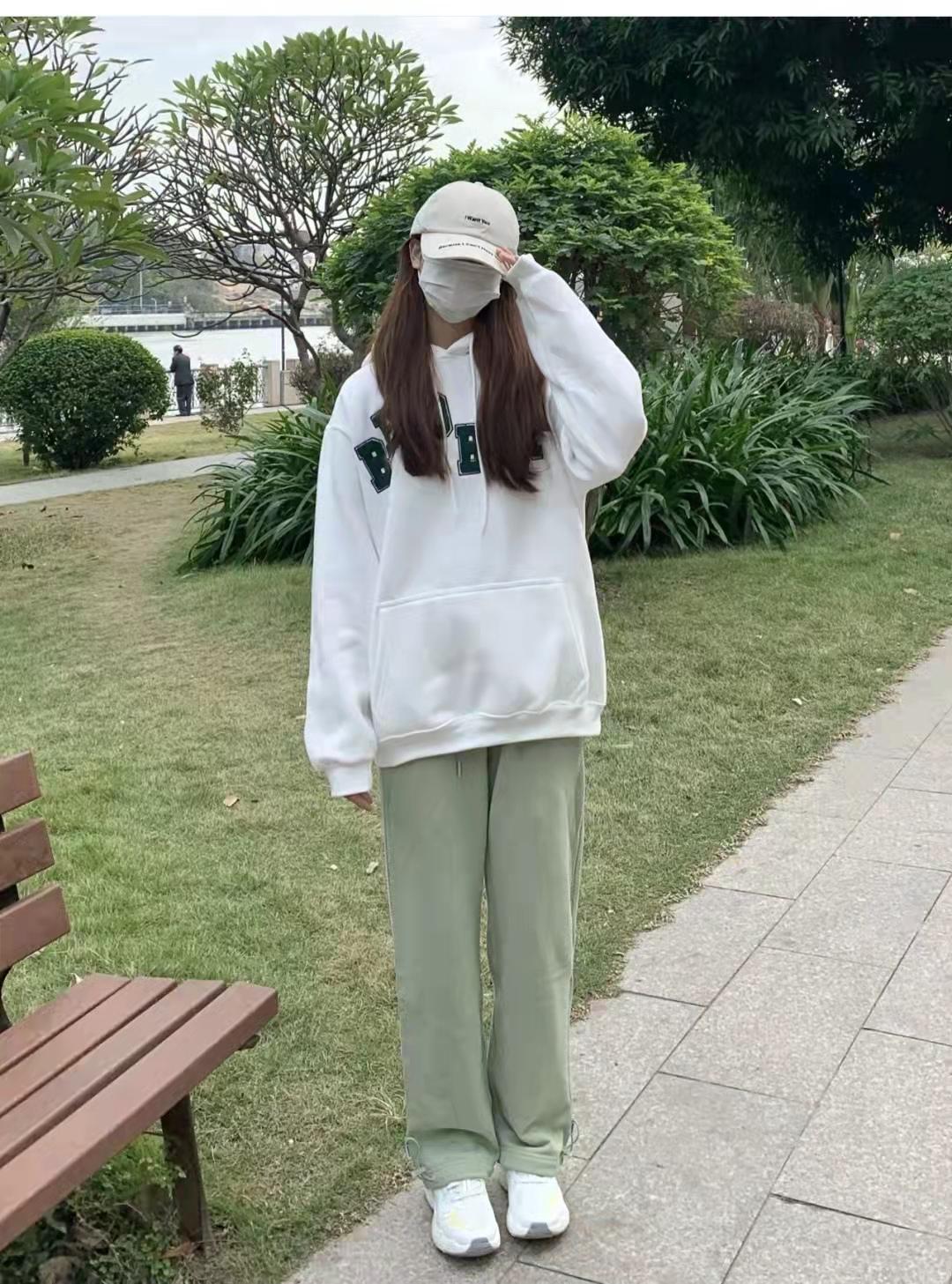 Sweatshirt outfit:Low saturation is paired with super milk and super clean. This outfit is warm and clean. The white sweater is printed with green letters. White and green go well with it and give people a very clean feeling; the pants are light. The light green color is very gentle and clean, and the straight shape is very slim; the color of the shoes is very tender, and the shoes are very light on the feet and not tiring at all when walking.